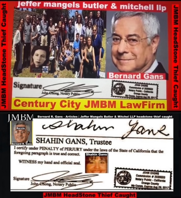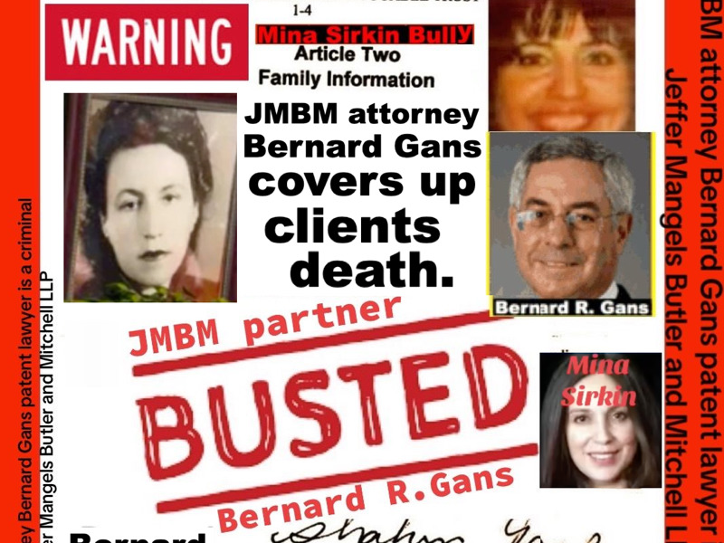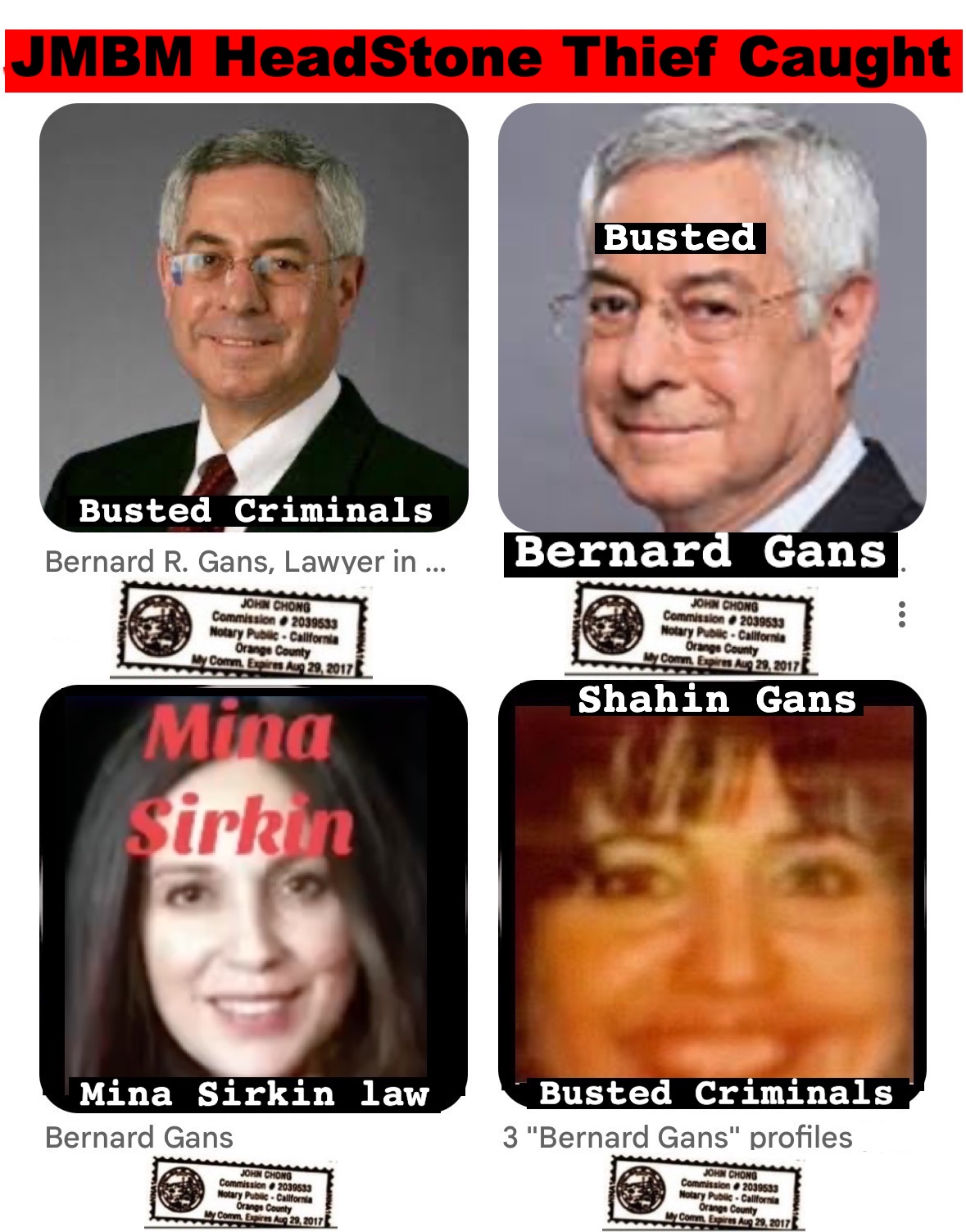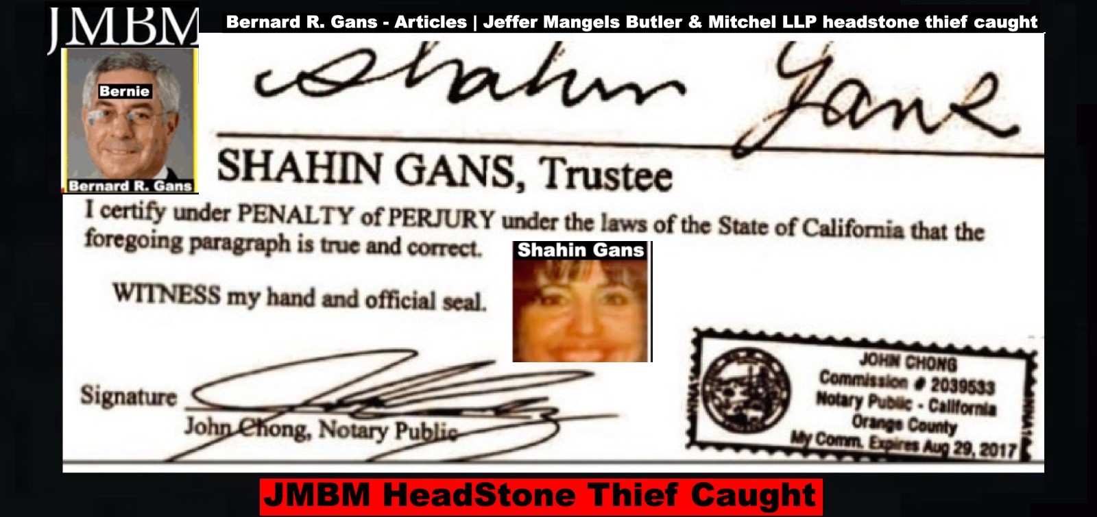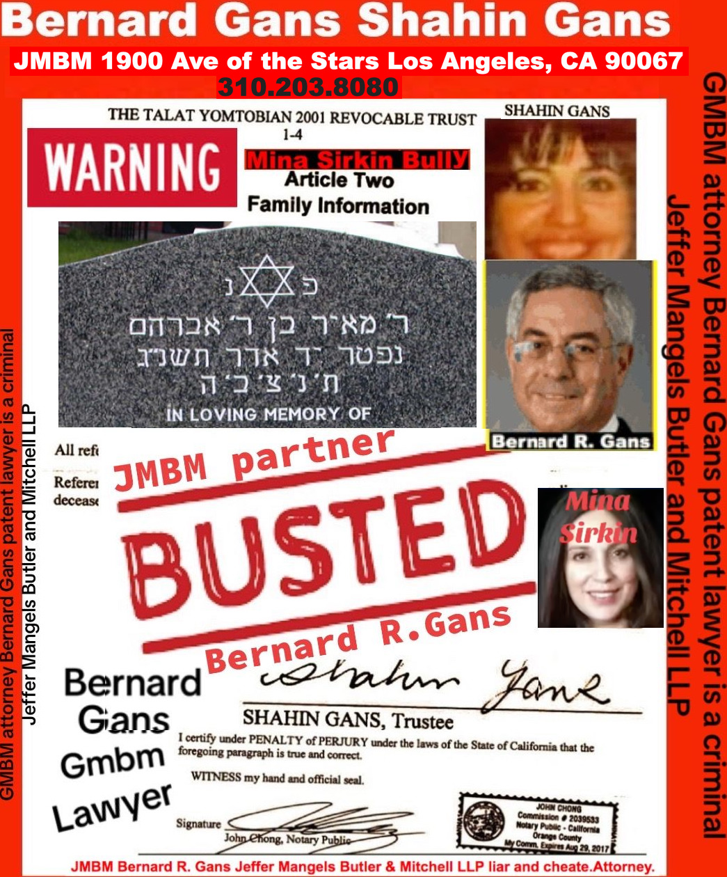 76 year old Century city JMBM busted attorney Bernard Reginald Gans known as Bernie graduate of Santa Barbara university married to Shahin Gans 50 years of success to satisfy his wife he made one stupid mistake and it all crashed down. Well done Bernie well done.Bernard R Gans Articles Jeffer Mangels Butler & Mitchel LLP